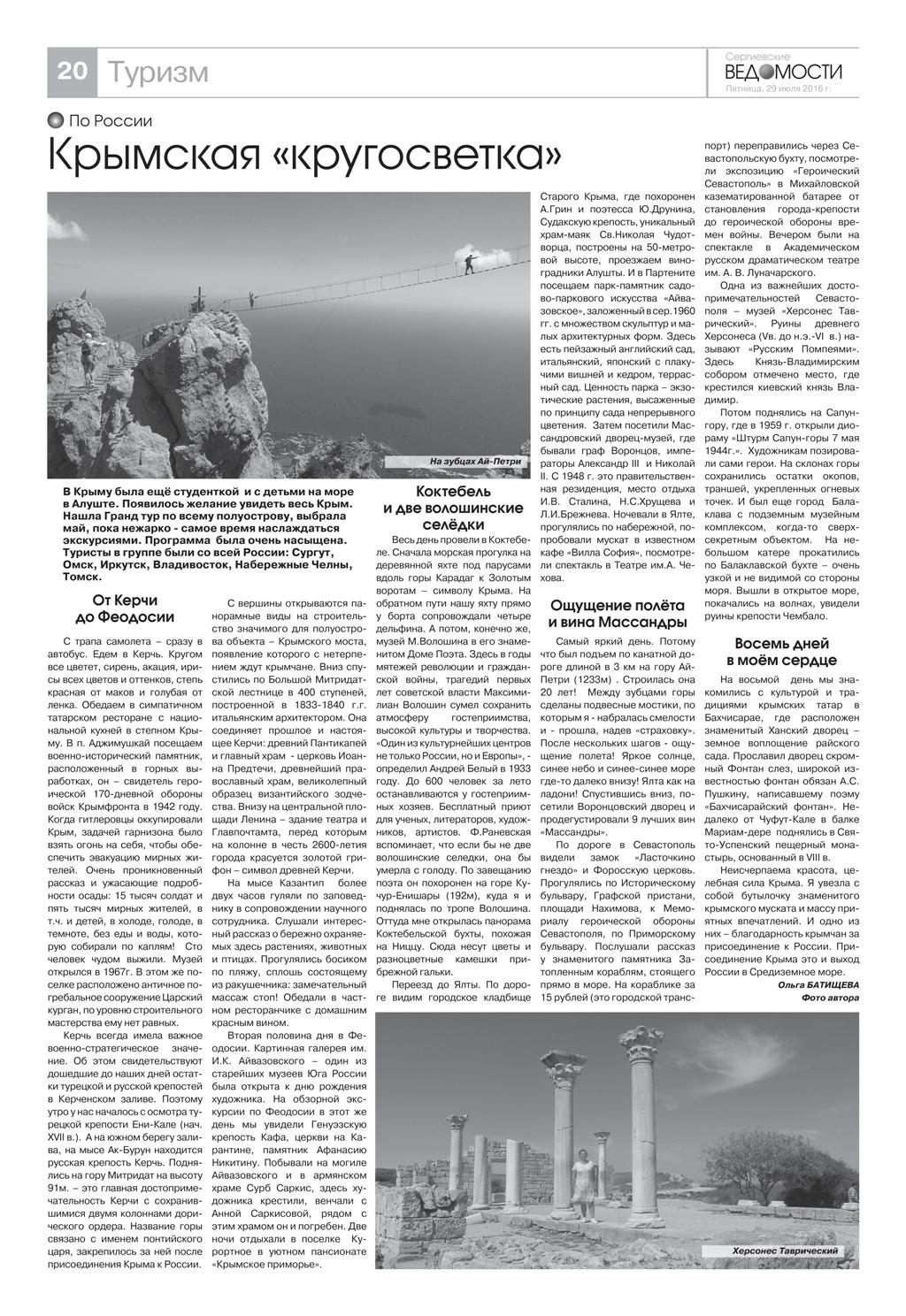 Про "Крымскую кругосветку" в газете "Сергиевские ведомости"Статья нашей туристки о поездке в Крым и экскурсионном туре "ГРАНД тур - Крымская кругосветка":