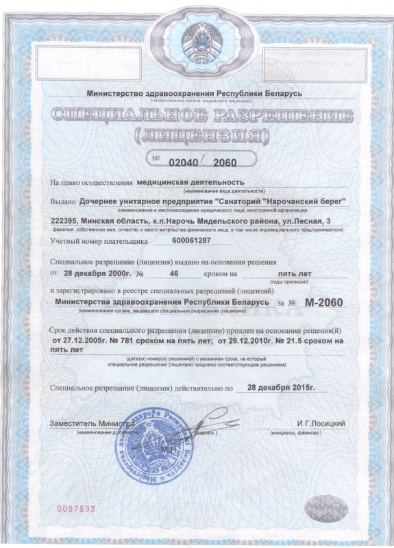 Беларусь, Минская обл., Мядельский р-н, к.п. Нарочь, ул. Лесная, 3. Доводим до Вашего сведения, что в течение сезона возможно изменение порядка и объема предоставления услуг, заявленных в концепции любого из отелей. Лечение: - болезни сердечно-сосудистой системы - болезни органов пищеварения Лечебная база: - ароматерапия - ванны общие - ингаляции (аэрозольтерапия) (аппараты "Pari Master", "Boreal" (минеральные, с лекарственными травами, масляные), "Галанеб")