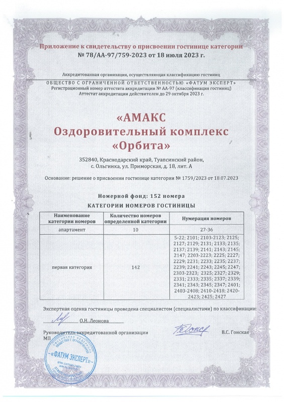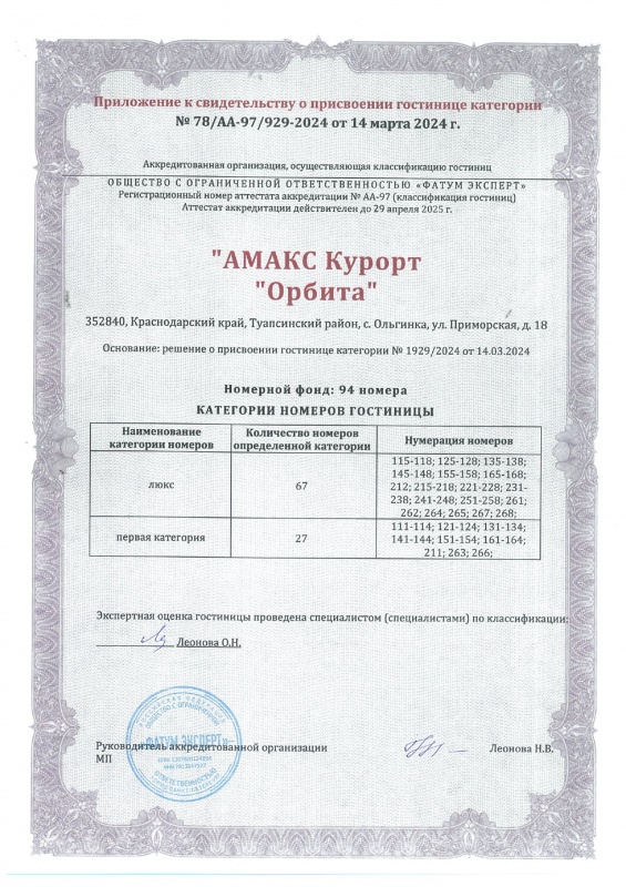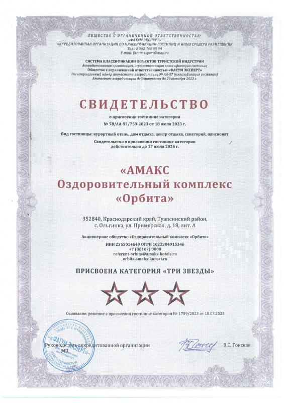 АМАКС Курорт «Орбита» - это живописный уголок на берегу Чёрного моря! Курорт "Орбита" ориентирован на комфортный семейный отдых, со всеми преимуществами санатория с современным уровнем сервиса четырехзвездочного отеля. Выбирая АМАКС Курорт «Орбита», вы получаете: огромную парковую территорию, прямой выход к морю, широкий спектр услуг по лечению и оздоровлению, рестораны, спортивные площадки, открытый и крытый бассейны, SPA-комплекс, активный отдых для детей и взрослых.