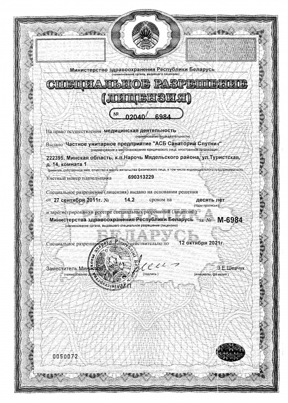 Доводим до Вашего сведения, что в течение сезона возможно изменение порядка и объема предоставления услуг, заявленных в концепции любого из отелей. Лечение: профиль лечения: - сердечно-сосудистая система; - нервная система; - опорно-двигательный аппарат Перечень процедур, входящих в стоимость путевки по кардиологическому профилю: -прием врача - 3 (первичный, в процессе лечения, при выписке), -массаж шейно-воротниковой зоны (через день), -сухая углекислая ванна Реабокс (через день), -две электропроцедуры по показаниям (через день), -две водные процедуры по показаниям (через день), -ЛФК по показаниям, -терренкур, -ЭКГ - контроль в процессе лечения по показаниям. Перечень процедур, входящих в стоимость путевки по профилю лечения заболеваний опорно-двигательного аппарата и заболеваний нервной системы: -прием врача-3 (первичный, в процессе лечения, заключительный), -классический частичный массаж (1 зона, через день), -одна тепловая процедура (через день), -одна электропроцедура (через день), -термомеханический массаж (через день), -ЛФК по показаниям, -консультация врача-рефлексотерапевта, -одна процедура локального грязелечения (через день), -одна водная процедура (через день). Перечень ван входящих в стоимость путёвки (один вид ванн, 5 процедур за 12 дней): -ванна жемчужная, -ванна морская, -ванна хвойная, -ванна с оксидатом торфа, -ванна валериановая, -ванна жемчужно-морская, -ванна жемчужно-хвойная, -ванна вихревая для верхних конечностей, -ванна вихревая для нижних конечностей, -четырехкамерная гальваническая ванна, -четырехкамерная гальваническая ванна с лекарственными средствами, -душ восходящий, -душ циркулярный. В стоимость путевки на 12 дней включено: -посещение бассейна (4 посещения), -локальное грязелечение (2 аппликации - 5 процедур).