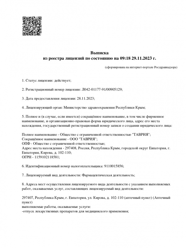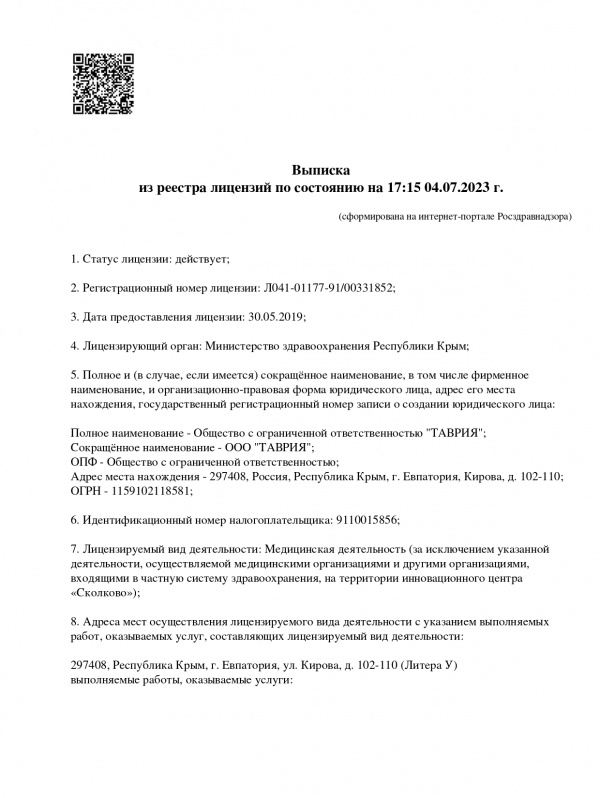 Санаторий «Таврия» один из крупнейших санаториев Евпатории с медицинской лицензией высшей акредитационной категории, позволяющей принимать для комплексного оздоровления и лечения, взрослых и родителей с  детьми от 7-х лет, по направлениям: лечение или профилактика заболеваний системы кровообращения, опорно-двигательного аппарата, заболеваний кожи и гинекологических заболеваний, любые виды профессиональных заболеваний. Прием ведут кандидаты медицинских наук, врачи высшей и первой категорий: терапевт, стоматолог, гинеколог, отоларинголог, физиотерапевт, невропатолог.