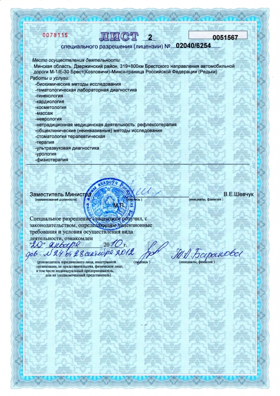 Дополнительные платные медицинские услуги: УЗИ акупунктура классическая амплипульстерапия анализ крови биохимический анализ крови общий анализ мочи общий аппликации озокеритовые аппликация парафино-озокеритовая аппликация сакских грязей аппликация сапропелевых грязей аромафитотерапия аэрофитотерапия вакуум терапия вакуумрефлексотерапия ванна ароматическая ванна вихревая ванна жемчужная ванна минеральная ванна скипидарная ванна хвойно-жемчужная ванны Клеопатры ванны вихревые, вибрационные ванны лекарственные ванны лечебные видимое, инфракрасное облучение галотерапия гидромагнитотерапия гинекологические анализы гирудотерапия грязевые аппликации дарсонвализация диадинамотерапия душ Шарко душ контрастный душ циркулярный души лечебные забор уретральных мазков иглорефлексотерапия ингаляции ингаляции лекарственными препаратами ингаляции ультразвуковые инструментальное удаление зубного камня интерференцтерапия инфракрасная сауна косметология терапевтическая криосауна лазеропунктура лазеротерапия лечение острой зубной патологии магнитолазеропунктура магнитотерапия магнитотерапия местная магнитотерапия полостная массаж механический массаж на массажном кресле надвенное облучение крови импульсным лазерным излучением на аппарате общая термотерапия общая термотерапия в SPA-капсуле пневмокомпрессионная терапия повторная консультация врача-гинеколога повторная консультация врача-рефлексотерапевта повторный приём врача-невролога повторный приём врача-терапевта подводный душ-массаж покрытие фторлаком одного зуба рефлексотерапия рефлексотерапия аурикулярная светолечение стоматологическое обследование стоматология терапевтическая сухая углекислая ванна тракционная терапия удаление внутриматочных контрацептивов ультрафиолетовое облучение ультрафонофорез фитотерапия флоатинг терапия фотохромотерапия экзогенная биорезонансная терапия электроакупунктура электрогрязелечение электропунктурная диагностика электросон электростимуляция нервно-мышечных структур электротерапия импульсными токами низкой частоты электрофорез постоянным, импульсным токами эхокардиография с доплеровским исследованием Рекомендуемые экскурсионные маршруты:- Вечерний Минск - Мемориальный комплекс "Хатынь" + Курган Славы - "Линия Сталина" - Мирный замок - Несвижский дворцово-парковыйансамбль - Слоним-Жировичи - Этнографический комплекс "Дудутки.