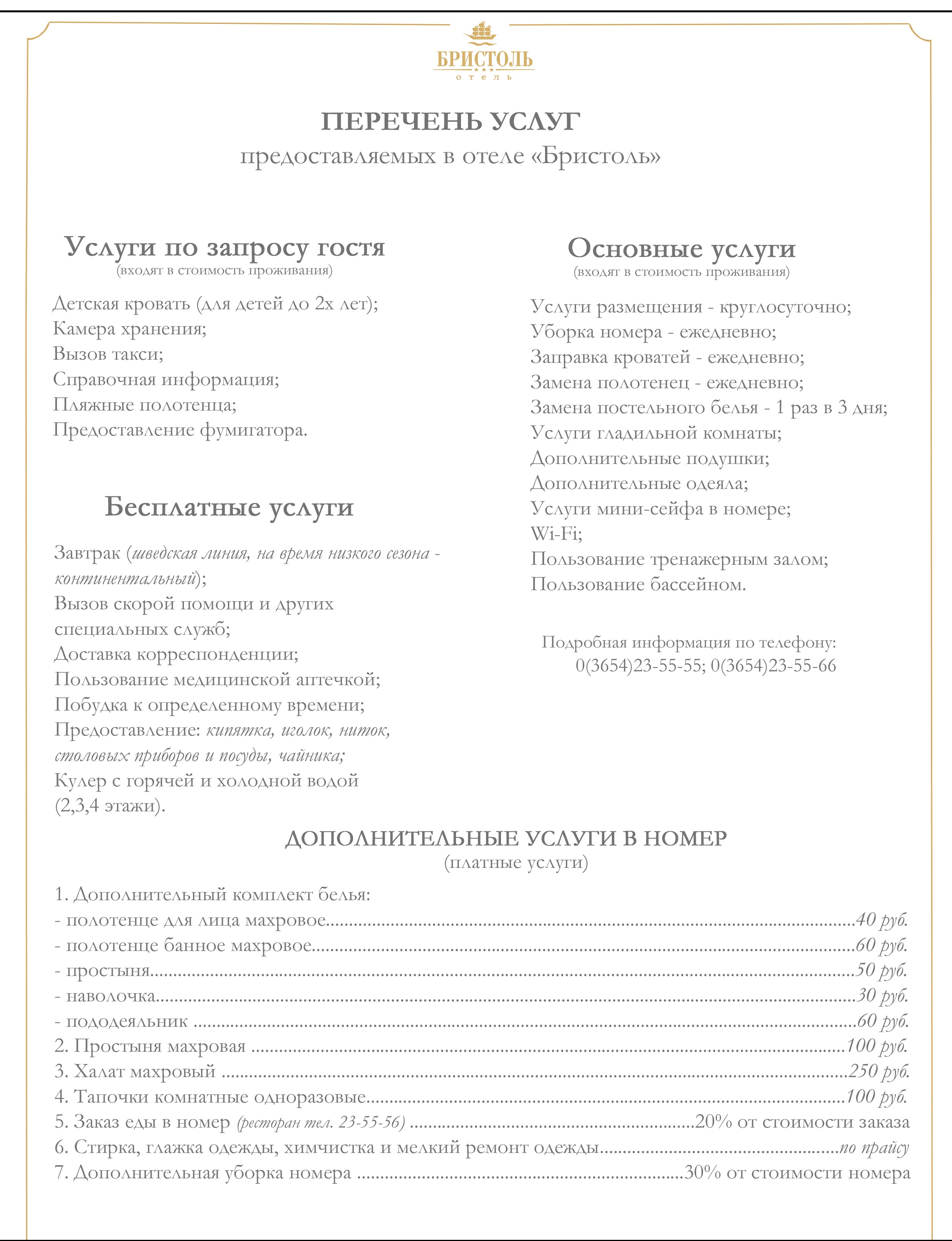 - ресторан "Бристоль": обеденный зал (70 мест), банкетный (30 мест)