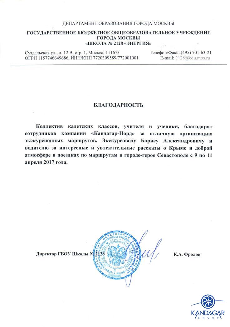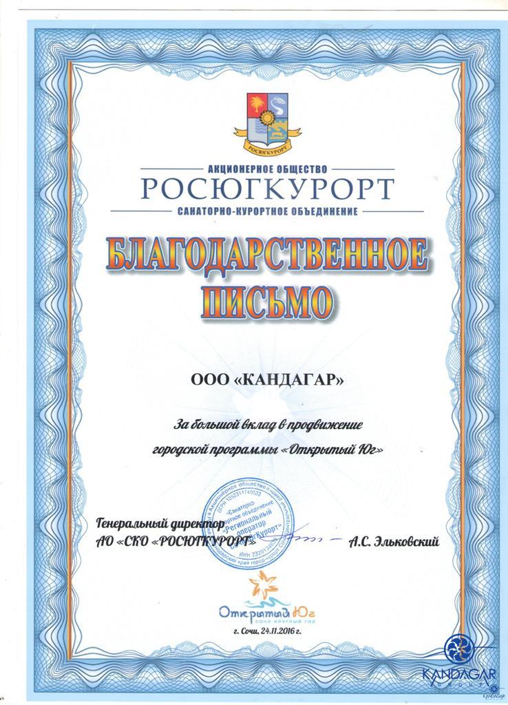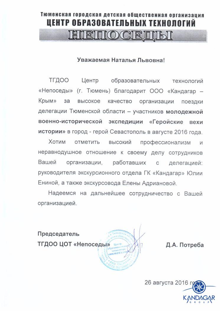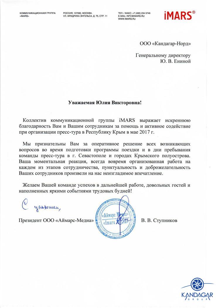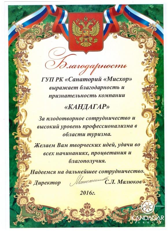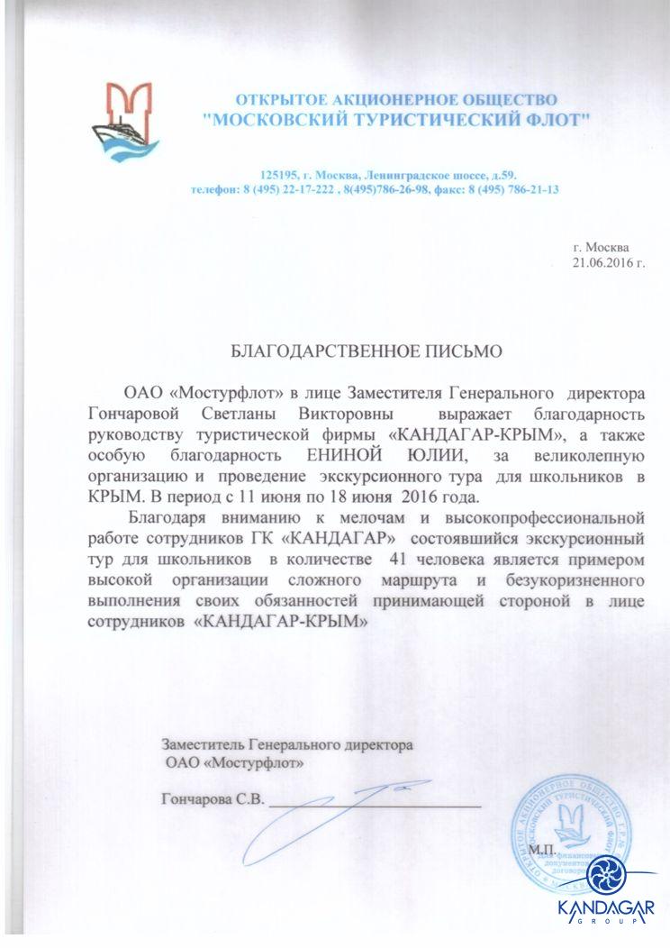Благодарности17.11.17 Уважаемые коллеги! Хотим поздравить Вашу замечательную компанию "Кандагар" с Днем рождения! Хотим пожелать Вам успехов и процветания. Мы сотрудничаем с Вашей компанией по направлению "летнего отдыха на море" с 2009 года и очень ценим таких надежных партнеров. Также в течение последних двух лет, с 2015 года мы работаем с Вами по направлению "приема организованных групп в Москве" через менеджера- Ржанухина Андрея. Хочется отметить его высокий профессионализм, четкость и оперативность в работе. С 4-5 ноября 2017 мы привозили группу взрослых в Москву и Ржанухин Андрей был у нас экскурсоводом 2 дня. Как оказалось он еще и интересный экскурсовод. P.S. Желаем уверенно идти намеченным курсом.ООО "Колибри-тур" 01.06.17 Коллектив коммуникационной группы iMARS выражает искреннюю благодарность сотрудникам ООО "Кандагар-Норд" за помощь и активное содействие при организации пресс-тура в Республику Крым в мае 2017 года. 01.05.17 Коллектив кадетских классов, учителя и ученики, благодарят сотрудников компании "Кандагар-Норд" за отличную организацию экскурсионных маршрутов в городе-герое Севастополе с 9 по 11 апреля 2017 года. 21.06.16 ОАО "Мостурфлот" выражает благодарность руководству туристической фирмы "Кандагар-Крым", а также особую благдарность Ениной Юлии, за великолепную организацию и проведение экскурсионного тура для школьников в Крым. В период с 11 июня по 18 июня 2016 года. 27.08.16 ТГДОО Центр образовательных технологий "Непоседы" (г. Тюмень) благодарит ООО "Кандагар-Крым" за высокое качество организации поездки делегации Тюменской области - участников молодежной военно-исторической экспедиции "Геройские вехи истории" в город-герой Севастополь в августе 2016 года. 21.12.16 ЗАО "СКО "РОСЮГКУРОРТ" выражает благодарность компании "Кандагар" за большой вклад в продвижение городской программы "Открытый Юг". 18.11.16 ГУП РК "Санаторий "Мисхор" выражает благодарность и признательность компании "Кандагар" за плодотворное сотрудничество и высокий уровень профессионализма в области туризма.