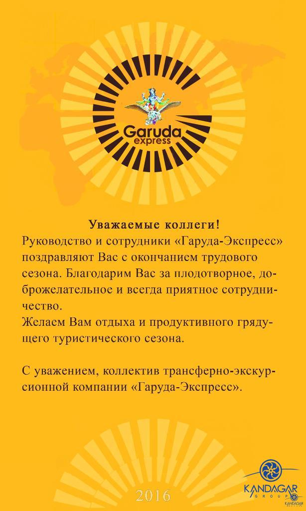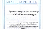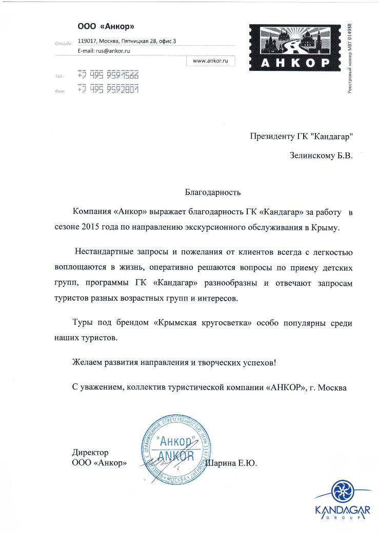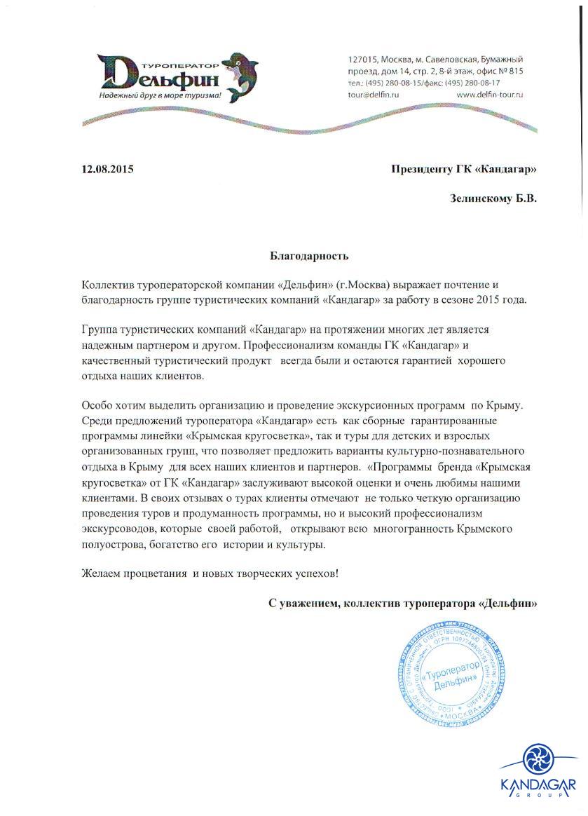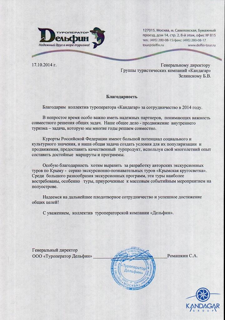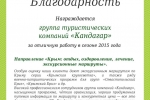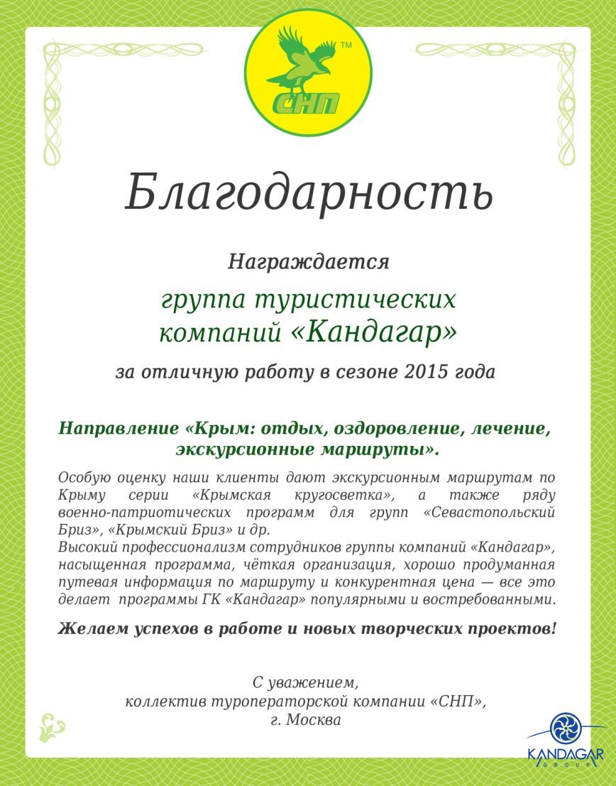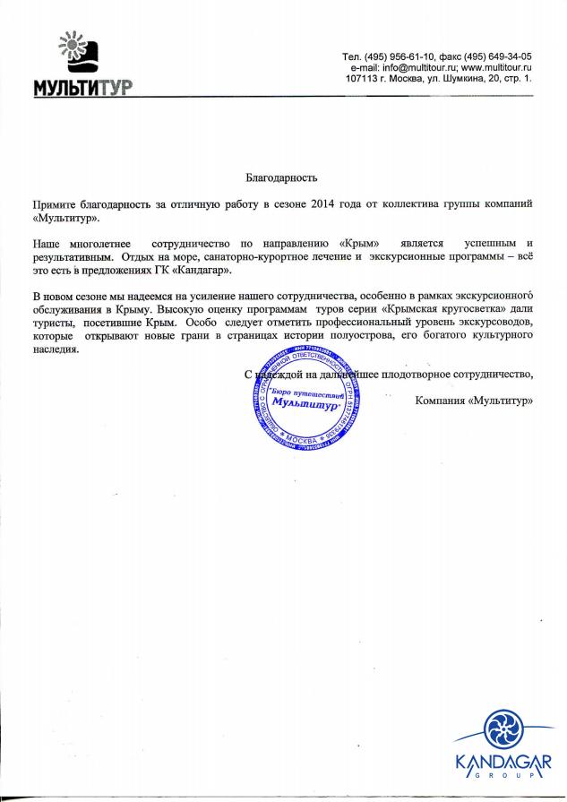 Благодарности02.11.16 Благодарность от трансферно-экскурсионной компании "Гаруда-Экспресс" за плодотворно сотрудничество в сезоне 2016. 18.08.15 Благодарность от туристической компании "СНП", г. Москва, за отличную работу в сезоне 2015 г. 07.10.14 Спасибо, Вам за предоставленную возможность увидеть красоты Крыма в дружной компании коллег / "Крымский релакс" 23.09-27.09. Не смотря на погоду поездка получилась интересная, познавательная, легкая. Южный берег Крыма хорош не зависимо от погоды, места размещения, концепции питания, инфраструктуры и т.д., но тем не менее приятно удивили объекты размещения для взыскательных клиентов (Солдайя, Крымский Бриз) отель Рэдиссон(Алушта) и Левант - достойный в своей категории. Большое спасибо всей фирме "Кандагар" за организацию тура, за радушный прием. Спасибо за великолепных гидов и профессионального водителя. И отдельное огромное спасибо, за то, что услышали мою просьбу и предоставили 1-номестное размещение.